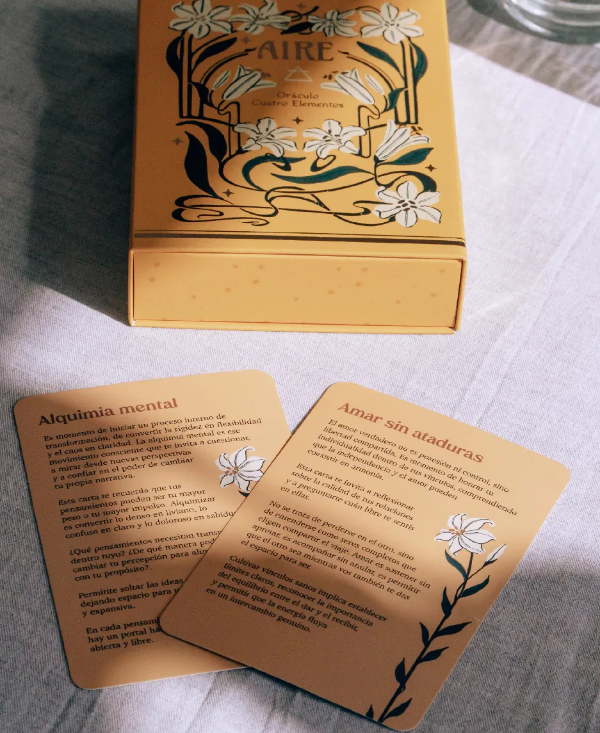 Contiene 30 cartas, y a través de ellas, descubrirás cómo el aire, con su movimiento y su capacidad de renovar el entorno, te conecta con nuevas ideas, perspectivas y conexiones. Abre tu mente, fortalece tu voz y permite que el aire te guíe hacia la evolución de tu ser. Un viaje hacia la expansión mental te espera.