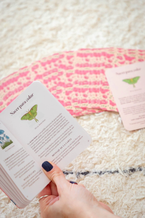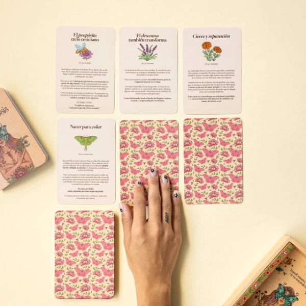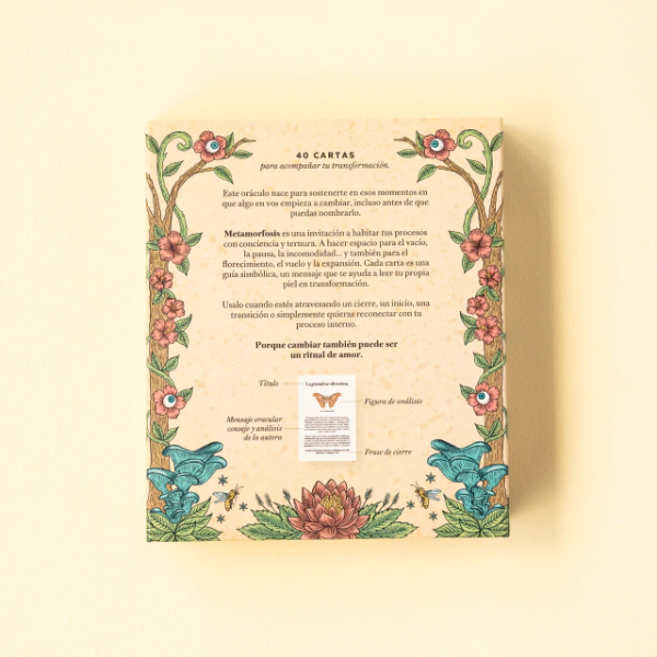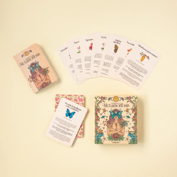 Metamorfosis es un oráculo de 40 cartas ilustradas inspirado en la naturaleza —mariposas, hongos y plantas— que nos enseñan que el cambio no es una excepción, sino el pulso mismo de la vida.